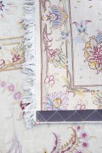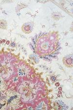 Tapis Kirman à médaillon central floral en croix sur champ jaune puis rose arrondi et champ principal à rinceaux de lotus sur champ beige, bordure principale d'une guirlande de fleurs et lotus sur champ beige.