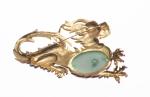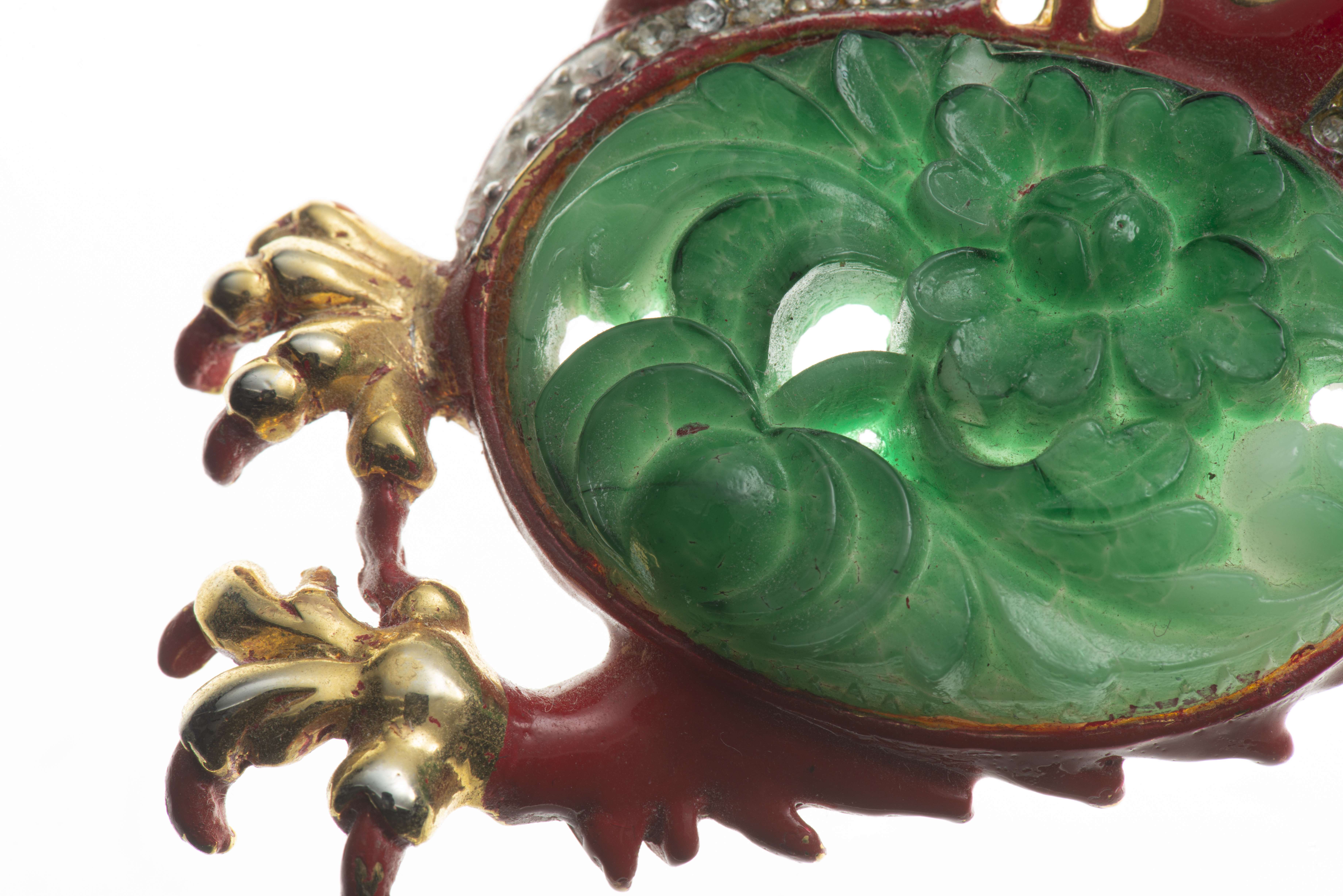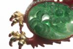 TRIFARI, broche dragon en métal doré et émaillé rouge, inclusion à l'imitation du jade épinard et strass.