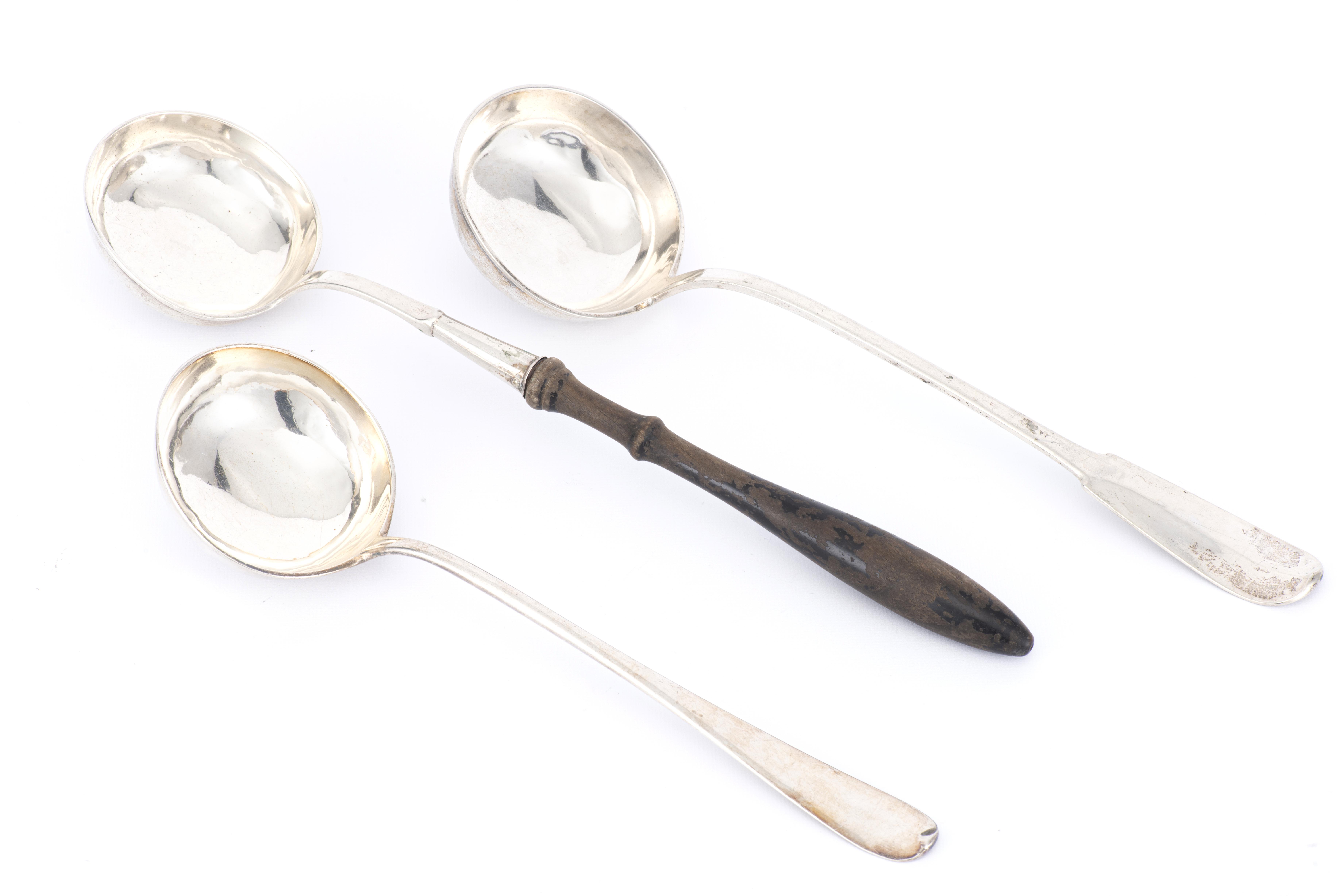 Trois louches en argent .800 de Vieux Lausanne, dont une par F. Jaques, une par FG et une autre par GL. XIXe