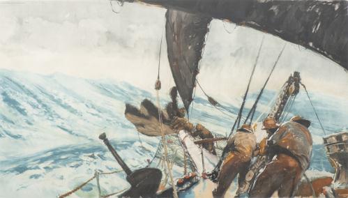 Albert BRENET (1903-2005), "Marins à la maneuvre par gros temps", Chromolithographie