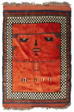 Tappis Gabbeh "Lori Face" à décor principal d'un visage sur champ rouge
